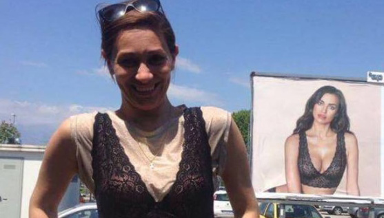 Si tratta di un’istantanea che richiama il conosciuto manifesto della campagna di Intimissimi: la bella Lara indossa il reggiseno della campagna sopra una maglia color carne: alle sue spalle si vede il manifesto.