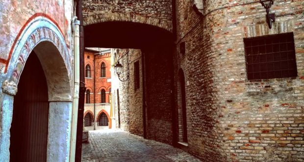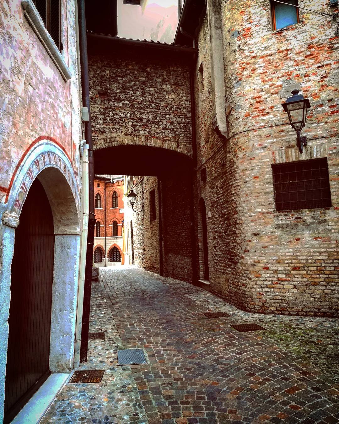 Il primo percorso si snoda interamente all’aperto lungo le vie del centro storico racchiuso per secoli entro le mura medievali. Il tour narra l’antico tessuto viario e le tracce del passato cittadino inscritto sulle facciate dei palazzi ricche di dettagli che abbiamo tutti i giorni sotto il naso ma che il più delle volte non cogliamo. La passeggiata parte dalla loggia comunale e dal Duomo per toccare poi i luoghi più significativi della città murata: palazzi Ricchieri e dei Capitani, piazza della Motta, chiesa e convento di San Francesco, piazza e chiesa del Cristo. Il percorso termina in contrada di San Marco con palazzo Rossittis e la facciata di Casa Simoni decorata con uno splendido affresco dello stemma civico.