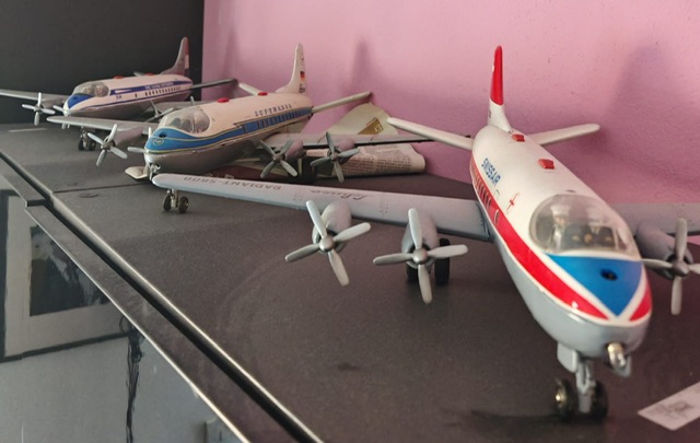 “In tanti anni, e ancora continuo, ho raccolto ciò che fu una mia passione fin da bambino: il mondo del volo – dice Alessandro Rinaldini -. Si tratta di aerei in latta con sofisticati meccanismi che o a molla o con l’uso di batterie consentono agli aeroplani in miniatura di accendere luci, aprire le porte e far comparire una hostess, muoversi con il rumore simulato dei jet o far girare a turno le eliche”. Giocattoli che hanno fatto sognare i bambini di tutto il mondo. “I miei modelli arrivano da ogni parte del mondo, acquistati a aste o mostre-scambio. Prediligo quei giocattoli che hanno un po’ di ruggine o che si presentato usati: immagino gli occhi dei bambini che li hanno fatti ‘volare’ nei loro giochi”.