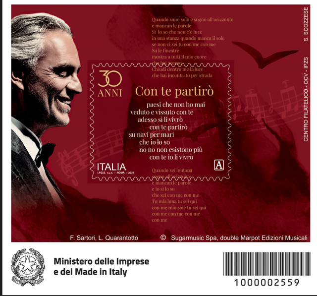 Poste Italiane comunica che oggi 23 ottobre 2025 viene emesso dal Ministero delle Imprese e del Made in Italy un francobollo appartenente alla serie tematica “le eccellenze del patrimonio culturale italiano” dedicato alla canzone Con te partirò, nel 30° anniversario, relativo al valore della tariffa A pari a 3,00€