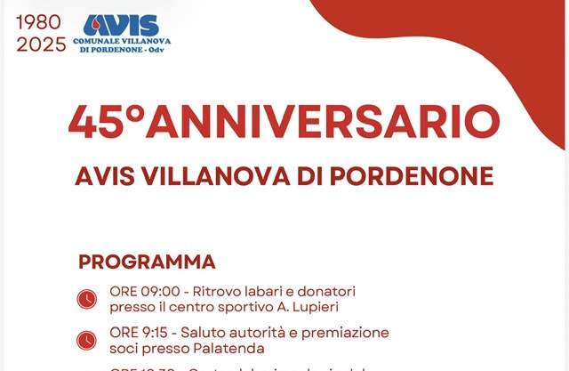 PORDENONE – La festa per il 45° anniversario dell’ AVIS di Villanova si terrà il 30 novembre, nel centro sportivo “A.Lupieri”, a partire dalle 9:00 con la premiazione dei soci più attivi: Lucia Lot 76 donazioni, Maurizio Sorana 79 donazioni e Lorenza Poletto con 164 donazioni. La Santa Messa nella chiesa di Cristo Re sarà celebrata alle ore 11.00.