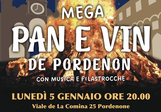 Al Villaggio del Fanciullo in Comina si terrà il Mega Pan e Vin de Pordenon organizzato da Associazione Panorama, dalla Fondazione Opera Sacra Famiglia e dall’Associazione Opera Sacra Famiglia. Da quale parte andrà il fumo e quali saranno i pronostici per il nuovo anno? Lo si scoprirà alle 20.00 con l’accensione del grande falò, accompagnato dalle immancabili filastrocche che saluteranno la fine delle feste, da musica, pinza e vin brulè.