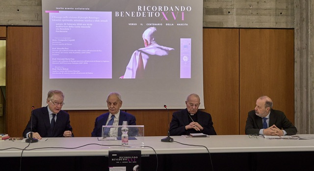 Anche il professor Giovanni Maria Vian, storico, direttore emerito dell’Osservatore Romano e già ordinario di Filologia Patristica alla Sapienza di Roma, ha voluto ricordare i famigerati “fatti del 2008”, quando il papa-teologo fu invitato all’inaugurazione dell’anno accademico dell’ateneo romano suscitando una reazione di sdegno da parte del corpo docente – compreso il futuro premio Nobel Giorgio Parisi –, reazione che portò Benedetto XVI a declinare l’invito: «Nelle università tedesche –, ha precisato Vian – ci sono le facoltà teologiche. Ratzinger era quindi abituato a parlare con i laici; un’abitudine che ha portato avanti anche da cardinale, da vescovo e poi da papa. Per questo ha sistematicamente perseguito il confronto con i laici». Mentre per tornare alle radici cristiane dell’Europa, Vian ha sottolineato l’interesse di Ratzinger per il Vecchio Testamento e l’importanza data all’ebraismo e al dialogo con gli ebrei: «Secondo Benedetto XVI le radici cristiane dell’Europa erano sempre anche radici ebraiche. Ciò è fondamentale e alquanto attuale in un’epoca come la nostra dominata da neosemitismo e neomarcionismo, ritornati prepotentemente, anche nella Chiesa cattolica, per ragioni ovviamente politiche».