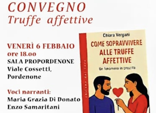 PORDENONE – La crescente diffusione delle truffe affettive, un tema sempre più attuale nella società digitale, sarà al centro del convegno in programma venerdì 6 febbraio alle ore 18.00, presso la Sala Propordenone di Viale Cossetti a Pordenone, promosso dalla Fidapa e dal Circolo Carlo Cojazzi.