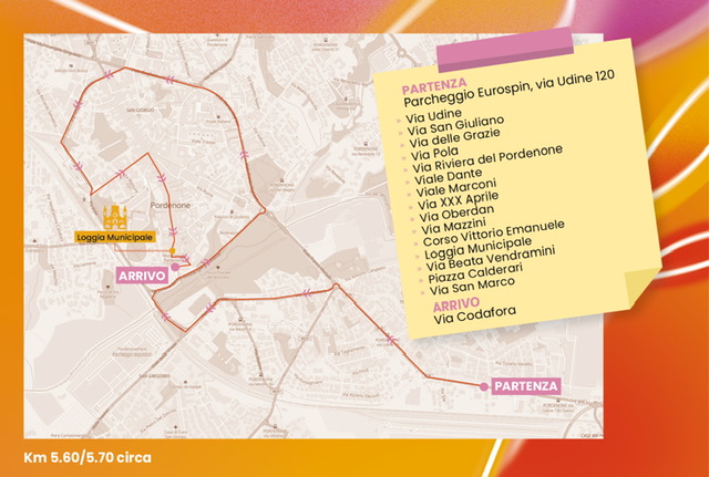 ​Come spiegato dal commissario Dei Cas, la partenza è prevista per le 9.15 circa dal parcheggio dell’Eurospin di via Udine. Si proseguirà poi per via Udine, via San Giuliano, via delle Grazie, via Pola, via Riviera del Pordenone, viale Dante, viale Marconi, via XXX Aprile, via Oberdan, via Mazzini, piazzetta Cavour, corso Vittorio Emanuele, Loggia del Municipio, via Beata Vendramini, piazzetta Calderari, via San Marco, con arrivo alle 10.30 circa in via Codafora.