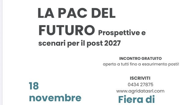 PORDENONE – Il 18 novembre, in Fiera a Pordenone, per “Agridata Incontra” si terrà “LA PAC DEL FUTURO. Prospettive e scenari per il post 2027”, incontro gratuito di formazione per aziende e professionisti del mondo agricolo (iscrizioni: app MyAgridata o www.agridatasrl.com).