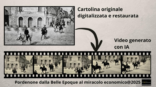 Questo video è un primo esperimento che apre la strada alla realizzazione di un cortometraggio di 15–20 minuti capace di far rivivere, con immagini e suoni d’epoca rielaborati dall’AI, intervallate da ricostruzioni con attori e comparse in carne ed ossa, la nostra città lungo i decenni del ’900, un progetto che ben si inserirebbe nel percorso di Pordenone Capitale della Cultura 2027.