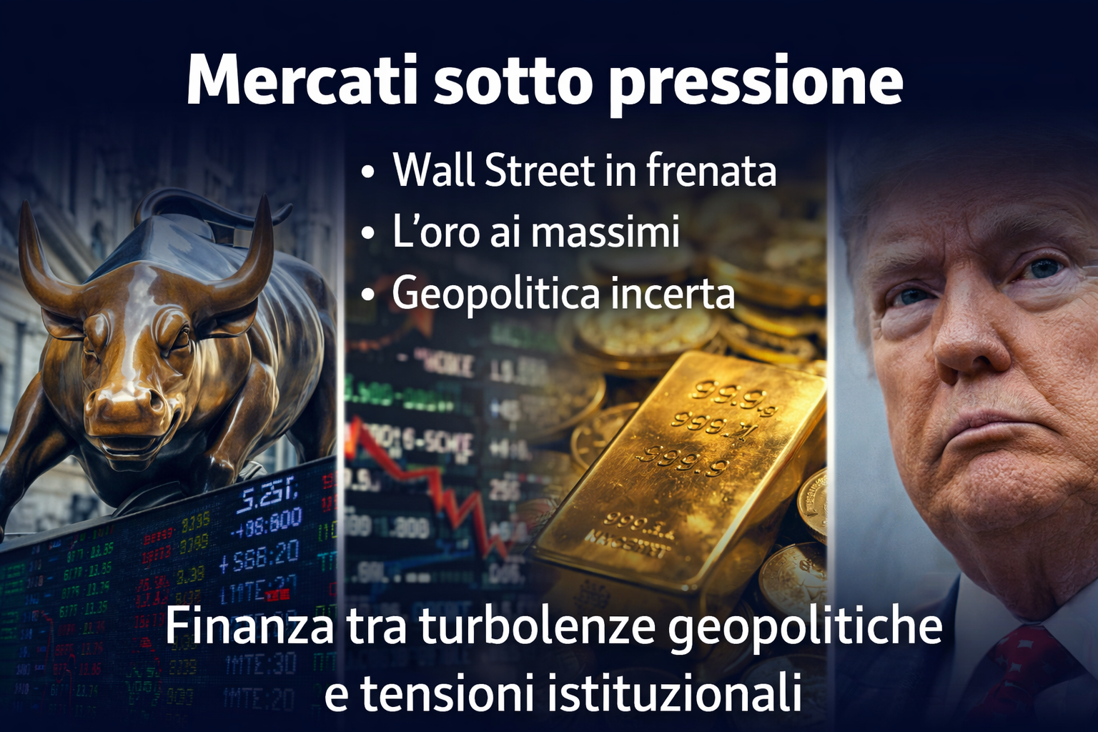 Dopo mesi di rialzi quasi ininterrotti, i mercati finanziari globali stanno mostrando i primi segnali di affaticamento. Wall Street frena dai massimi storici, mentre l’oro aggiorna nuovi record e le materie prime tornano protagoniste. A pesare non sono solo i dati economici, ma soprattutto un mix sempre più delicato di tensioni geopolitiche, scontri istituzionali e incertezze sulla politica monetaria americana.