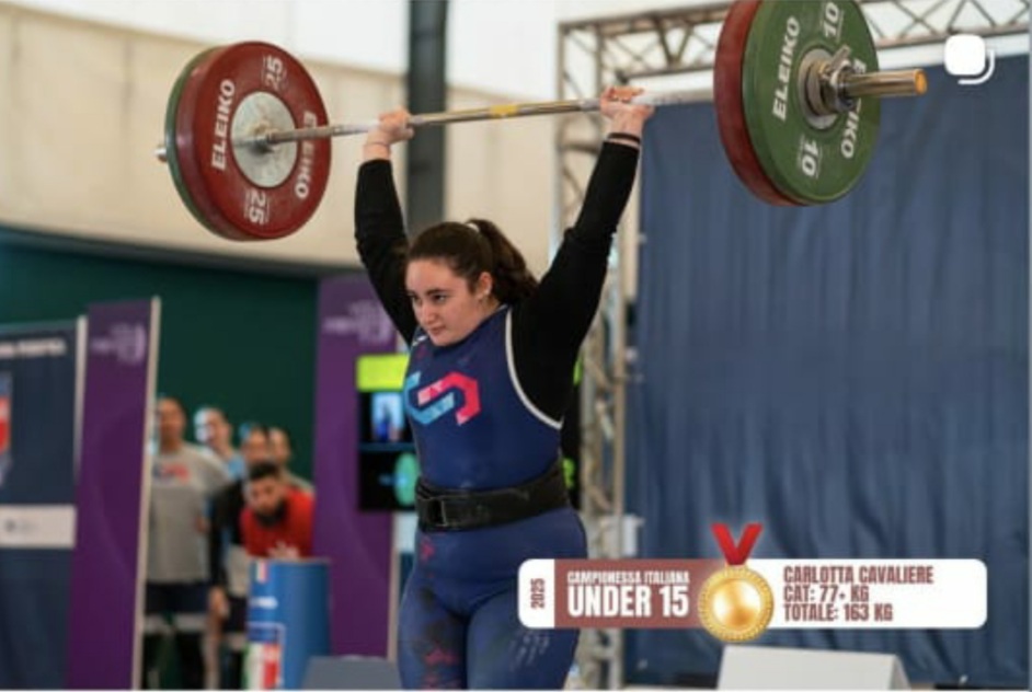 I titoli italiani sono arrivati anche grazie alle due atlete reduci dagli Europei Under 15: Carlotta Cavaliere (nella foto in alto), che ha dominato con 70 kg di strappo e 93 kg di slancio, e Vittoria Turchet, che ha firmato una gara combattutissima con 86 kg di slancio all’ultimo tentativo, conquistando il titolo. A completare un podio di altissimo livello è arrivato l’argento di Alessia Bellia, con 70 kg di strappo e 78 kg di slancio, atleta da poco entrata nel gruppo ma già in crescita costante.