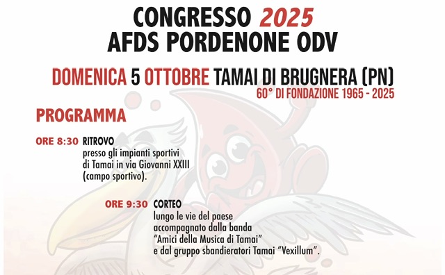 Il programma della giornata prevede il ritrovo presso gli impianti sportivi di Tamai, in via San Giovanni XXIII, alle 8.30. Alle 9.30 partirà il corteo verso la chiesa parrocchiale di Santa Margherita Vergine e Martire, accompagnato dalla banda “Amici della Musica di Tamai” e dal gruppo sbandieratori “Vexillum”. Alle 10 sarà celebrata la messa dedicata ai donatori. Alle 11.15, nel salone dell’oratorio, si terrà il Congresso, con il saluto delle autorità e la consegna delle
